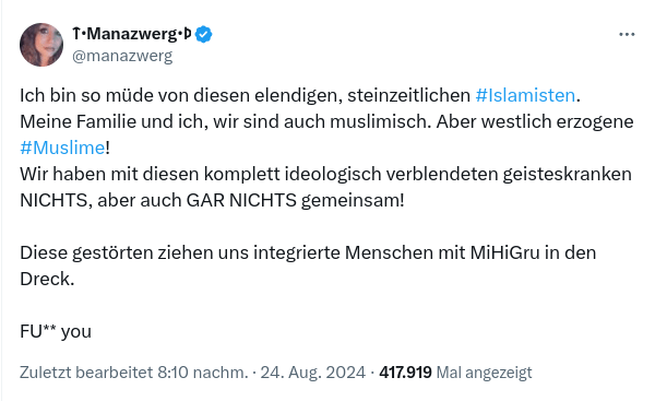 Dieser Tweet sagt einiges über die muslimische Community. Er wurde abgesetzt, nachdem in Solingen ein syrischer Islamist drei Menschen mit einem Messer ermordete und mehrere weitere verletzte.